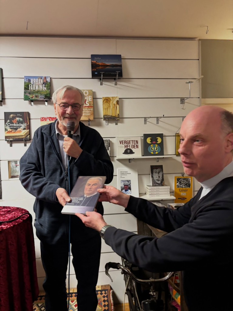 Vervolgens was de beurt aan Koos LInders over een andere publicatie die hij maakte: Pieter Paul Joseph Nicolaye (1873-1948) en de uitdaging van de opkomende moderniteit in Heerlen. Bij die gelegenheid overhandigde Koos Linders deken Hans Bouman, de huidige deken van Heerlen het eerste exemplaar van het boek over zijn voorganger, deken Nicolaye.
