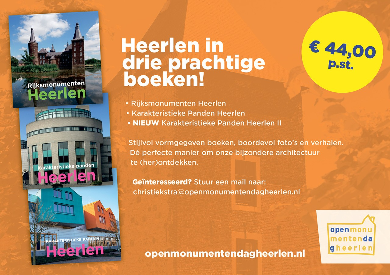 De boeken zijn te verkrijgen via Al Kerckhoffs, Bestuurslid Stichting Open Monumentendag Heerlen, Putgraaf 297, 6411GT Heerlen. TElefoon 06 – 25 45 10 32, e-mail alkerkhofffs@ziggo.nl