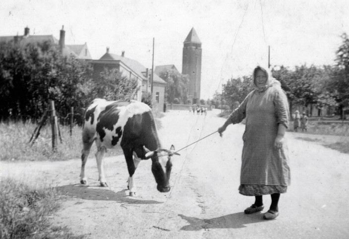 Vrouw met koe en de kerk van Leveroy op de achtergrond